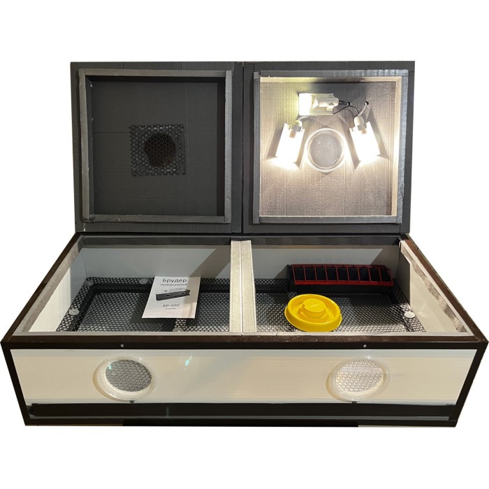 У цьому брудері напувалка+ годівниця входить до комплекту. Регулятором температури служить димер, встановлений на шнурі - він зменшує або збільшує напруження на лампах, тим самим підвищуючи або знижуючи температуру. У комплекті також встановлений градусник на оглядове вікно всередині брудера.